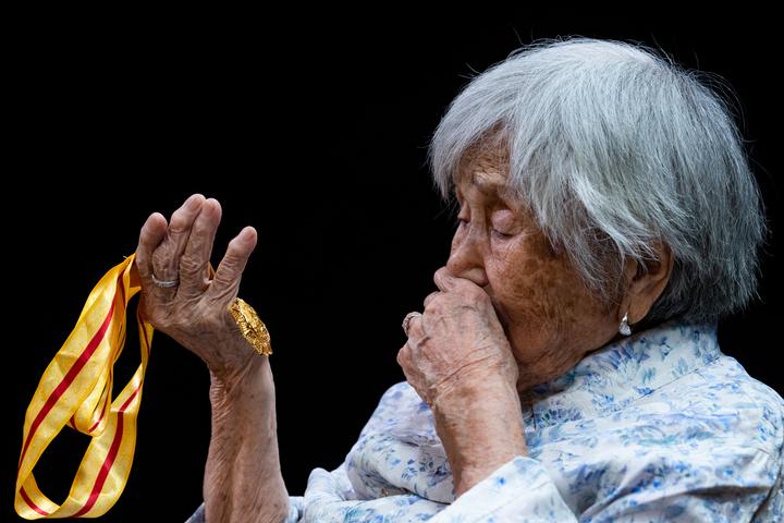白改華手捧紀念章,回憶抗戰經(jīng)歷。新華社資料片