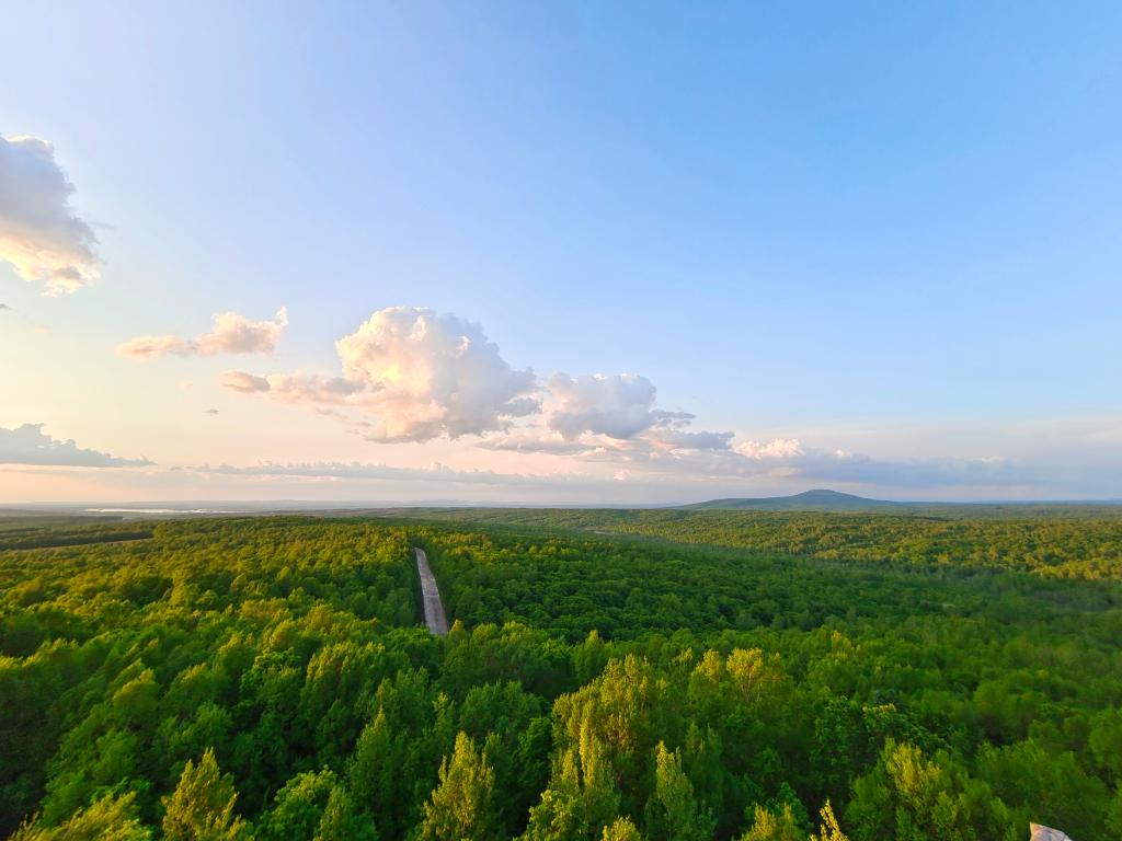 5月27日,在伊春市嘉蔭縣太平林場(chǎng)紅旗營(yíng)林區的一座瞭望塔上拍攝的營(yíng)林區林海。新華社記者 陳聰 攝