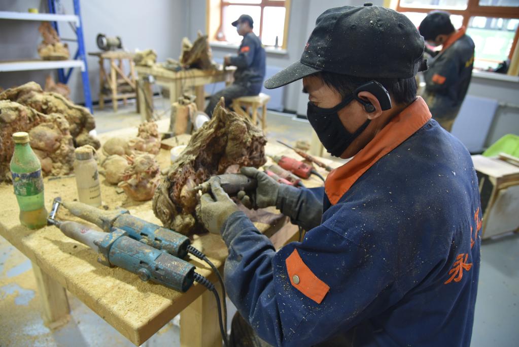 工人在永達木藝北沉香工藝品加工車(chē)間內加工木雕產(chǎn)品。(受訪(fǎng)者供圖)