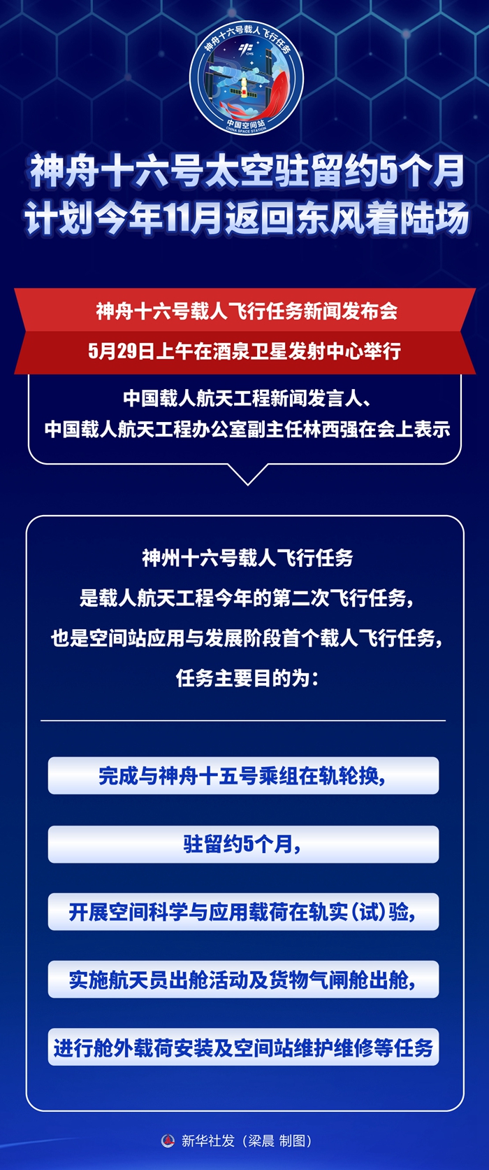 新華社酒泉5月29日電 神舟十六號載人飛行任務(wù)新聞發(fā)布會(huì )5月29日上午在酒泉衛星發(fā)射中心舉行。中國載人航天工程新聞發(fā)言人、中國載人航天工程辦公室副主任林西強在會(huì )上表示,神舟十六號載人飛船駐留約5個(gè)月,計劃于今年11月返回東風(fēng)著(zhù)陸場(chǎng)。
