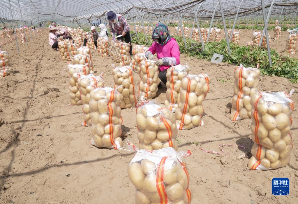 6月8日,昌黎縣新集鎮西新莊村農民在田間將收獲的馬鈴薯打包。