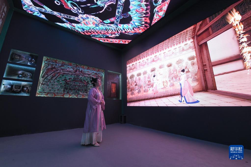 6月8日,一名身著(zhù)傳統服飾的觀(guān)眾在文博會(huì )甘肅展臺觀(guān)看數字敦煌展覽。
