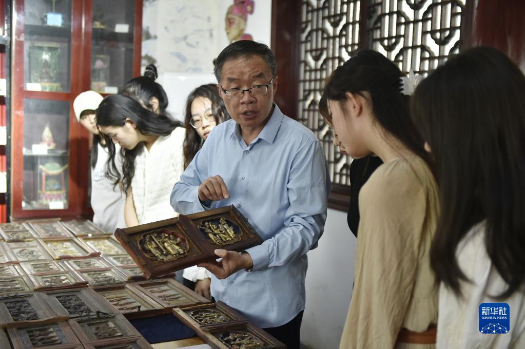 6月7日,張俊濤在開(kāi)封市“汴京燈籠張”彩燈展覽館內向來(lái)訪(fǎng)的大學(xué)生們介紹自己收集的家用傳統木雕。