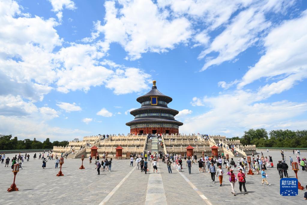 6月9日,游客在藍天白云下的天壇祈年殿游覽。