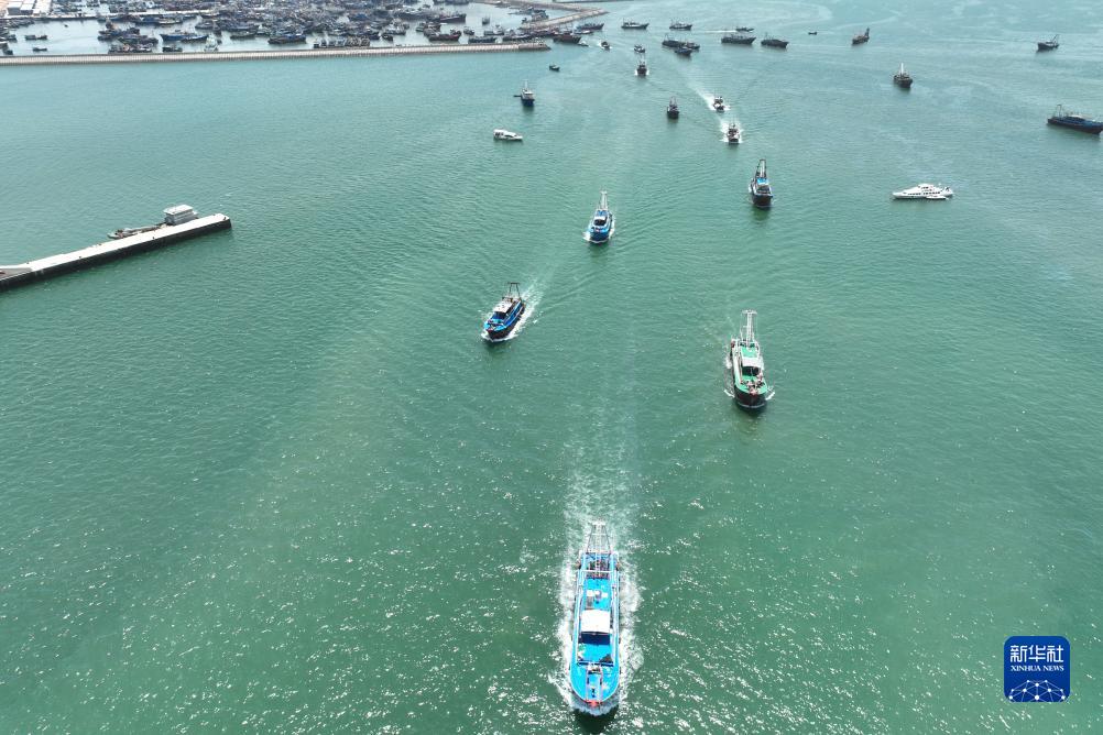 8月16日,漁船從海南省臨高縣新盈港駛向南海(無(wú)人機照片)。新華社記者 張麗蕓 攝