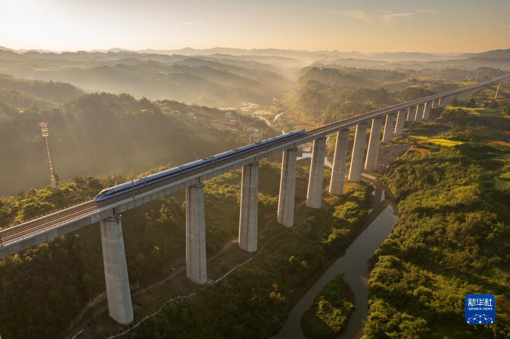 8月31日,一列動(dòng)車(chē)組在晨曦中經(jīng)過(guò)位于貴州省獨山縣郊外的貴南高鐵銀坡河特大橋(無(wú)人機照片)。新華社記者 劉續 攝