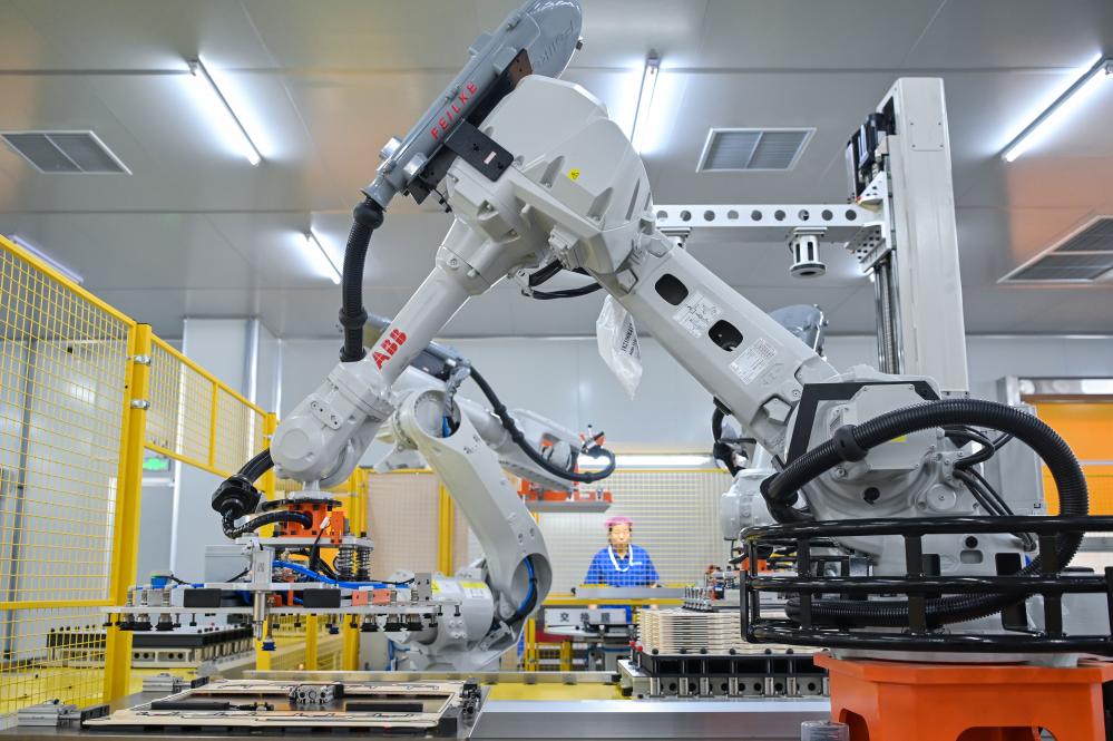 智能機器人在緯景儲能鹽城智造基地生產(chǎn)車(chē)間進(jìn)行鋅鐵液流電池電堆總裝堆疊作業(yè)(9月8日攝)。新華社記者李博 攝
