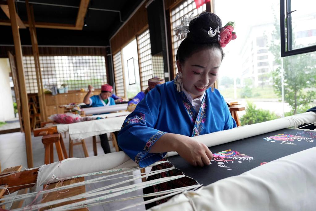 8月25日,繡娘在貴州省黔東南苗族侗族自治州施秉縣一家非遺企業(yè)苗繡生產(chǎn)車(chē)間趕制訂單。新華社發(fā)(王炳真攝)