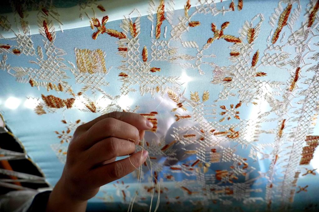 初登國際時(shí)尚舞臺,她們難免興奮又緊張,但每一次熟練、從容的手起針落,又無(wú)不展現著(zhù)她們對苗繡這一中國傳統民族文化的自信。
