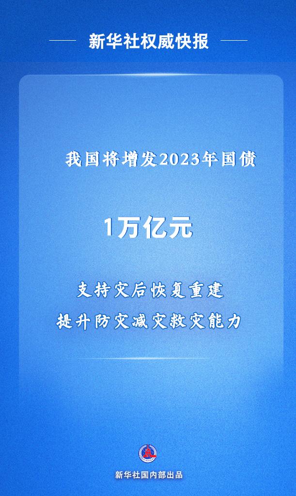 新華社北京10月24日電(記者申鋮)中央財政將在今年四季度增發(fā)2023年國債10000億元,增發(fā)的國債全部通過(guò)轉移支付方式安排給地方,集中力量支持災后恢復重建和彌補防災減災救災短板,整體提升我國抵御自然災害的能力。