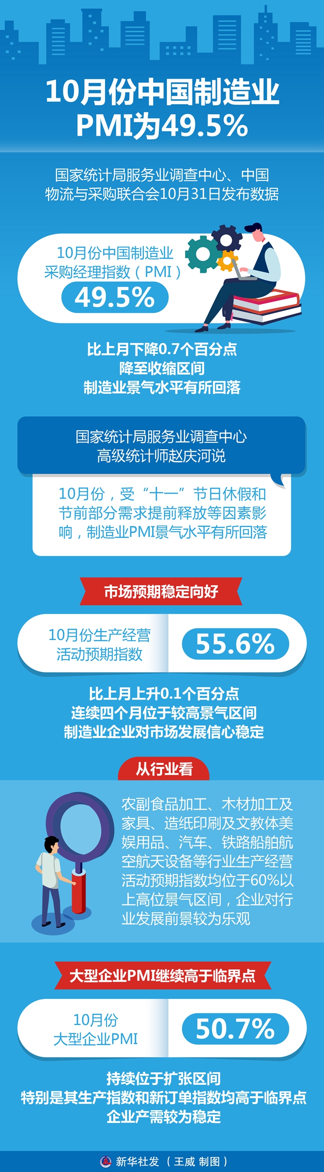 新華社北京10月31日電(記者魏玉坤)國家統計局服務(wù)業(yè)調查中心、中國物流與采購聯(lián)合會(huì )10月31日發(fā)布數據,10月份,中國制造業(yè)采購經(jīng)理指數(PMI)為49.5%,比上月下降0.7個(gè)百分點(diǎn),降至收縮區間,制造業(yè)景氣水平有所回落。