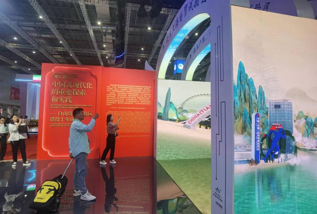 這是正在國家會(huì )展中心(上海)舉辦的第六屆中國國際進(jìn)口博覽會(huì )國家綜合展的一個(gè)特別部分“中國式現代化的重要探索和實(shí)踐——自由貿易試驗區建設十年成就展”。它位于中國國家館內,通過(guò)高清視頻、珍貴照片、實(shí)物模型等,講述中國各地自貿試驗區建設的改革開(kāi)放故事。
