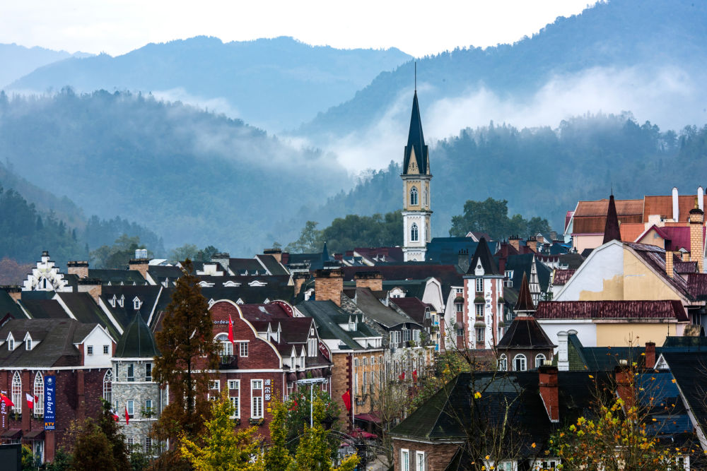 從成都往西北,驅車(chē)一個(gè)多小時(shí),就能到達有“天府金彭、蜀漢名區”之稱(chēng)的彭州市。再從彭州一路向北,駛入35公里的大山深處,闖入眼簾的,竟是一座滿(mǎn)是彩色尖頂房子和精巧法式陽(yáng)臺的小鎮,感覺(jué)像是從彭州穿越到了歐洲。