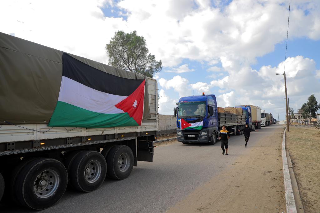 11月20日,裝載野戰醫院設備的貨車(chē)停在加沙地帶南部城市汗尤尼斯。巴勒斯坦安全部門(mén)人士告訴新華社記者,來(lái)自約旦的野戰醫院設備已于當天經(jīng)由拉法口岸進(jìn)入加沙,該野戰醫院將設在加沙地帶南部城市汗尤尼斯。新華社發(fā)(里澤克·阿卜杜勒賈瓦德攝)
