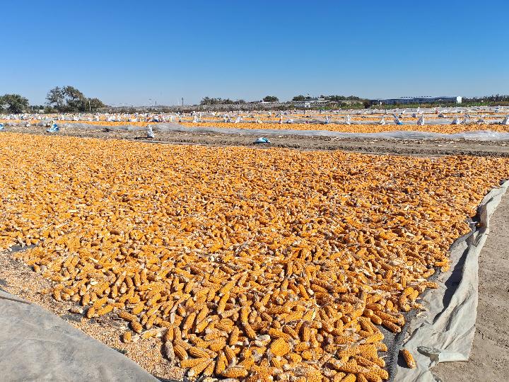 新疆昌吉回族自治州奇臺縣晾曬場(chǎng)上等待脫粒交售的玉米。新華社記者茍立鋒 攝