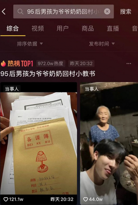 今年開(kāi)學(xué)季,一則“95后男孩為爺爺奶奶回村小教書(shū)”的短視頻被網(wǎng)友們送上了抖音熱榜第一。