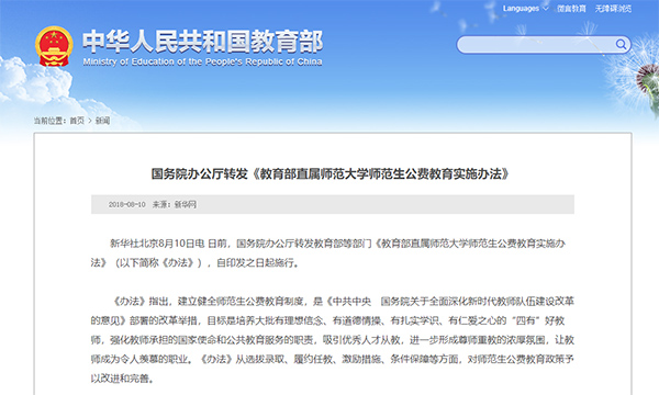 2018年8月,國務(wù)院辦公廳印發(fā)通知,轉發(fā)教育部等部門(mén)《教育部直屬師范大學(xué)師范生公費教育實(shí)施辦法》,對部屬師范大學(xué)師范生公費教育政策做了系統全面規定。將“師范生免費教育政策”調整為“師范生公費教育政策”。履約任教服務(wù)年限從原來(lái)的10年調整為6年以上。
