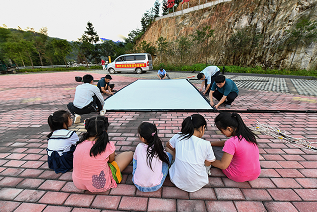 2021年9月18日,在常寧市塔山瑤族鄉東江村,公益電影放映隊隊員在搭幕布。新華社發(fā)(周秀魚(yú)春 攝)