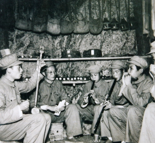 王莘在朝鮮戰場(chǎng)和慰問(wèn)團排練《歌唱祖國》(左二為王莘)