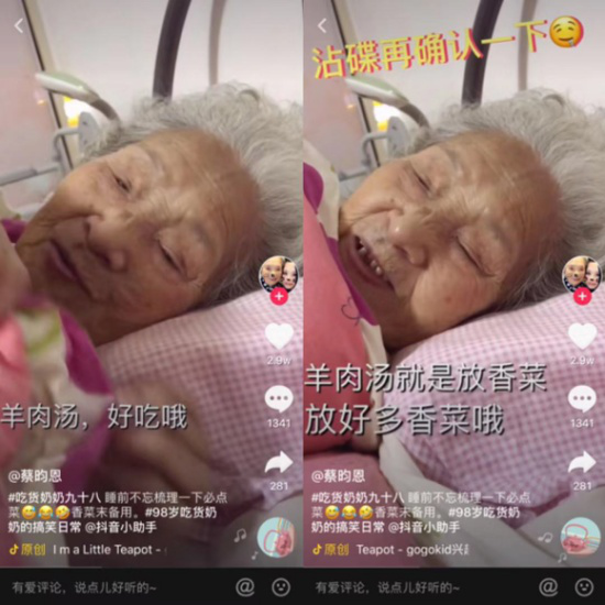 但凡喜歡刷抖音的人,一定刷到過(guò)百歲“吃貨奶奶”的視頻,老年“少女”開(kāi)開(kāi)心心喝可樂(lè )、奶茶、白酒,吃火鍋、燒烤、串串、漢堡、雞腿、雪糕……因為反差萌,吸引了不少鐵桿小粉絲,如今她的抖音粉絲近700萬(wàn),獲贊過(guò)億。