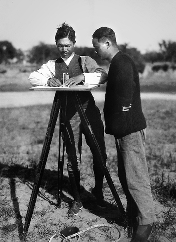 殷墟第一次發(fā)掘,董作賓(右)參與測量繪圖(資料照片)。新華社發(fā)(安陽(yáng)市殷墟博物館提供)