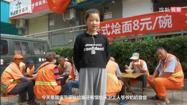 在鄭州市豐慶路的一家飯店門(mén)前,12歲的小女孩拿出過(guò)生日時(shí)收到的200元,買(mǎi)了食材請爸爸做羊肉燴面,免費請環(huán)衛工吃。中午12點(diǎn),一碗碗熱騰騰的羊肉燴面端到了環(huán)衛工人的桌子上,每碗面還配著(zhù)一個(gè)鍋盔。女孩表示國慶節大家都放假了環(huán)衛工人還要工作,非常辛苦。