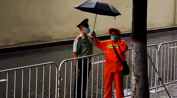 這是今年9月份一段網(wǎng)上流傳很廣的視頻的截圖。故事很簡(jiǎn)單,一位環(huán)衛工人為冒雨執勤的武警戰士撐傘。