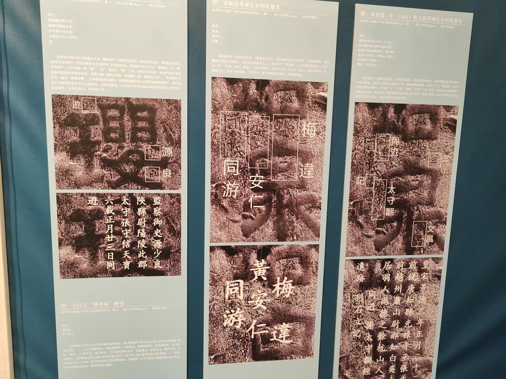 重新發(fā)現的唐代“源少良等神尼舍利塔題名”題刻的放大圖片(左一),它后來(lái)被元代的“瓔珞泉”題刻覆蓋了。記者馮源 攝