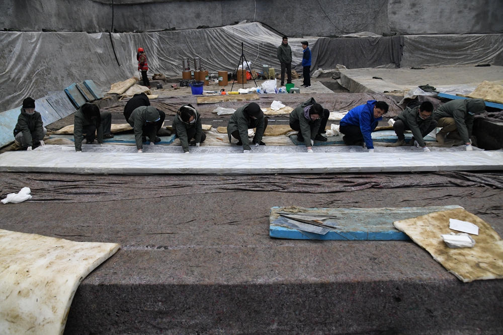 再比如,在安徽淮南武王墩一號墓考古項目中,國家文物局考古研究中心負責出土文物現場(chǎng)保護與多學(xué)科研究,在技術(shù)、方法上也做了一些新的探索?,F場(chǎng)保護方面,我們將薄荷醇應用于潮濕環(huán)境,成功提取了200余平方米覆蓋在槨蓋板上的竹席,是目前國內外開(kāi)展的面積最大的古代竹席提取工作。首次采用水凝膠、環(huán)氧樹(shù)脂碳纖維布復合材料配合套箱技術(shù),在田野考古發(fā)掘現場(chǎng)完成大型文物加固提取。