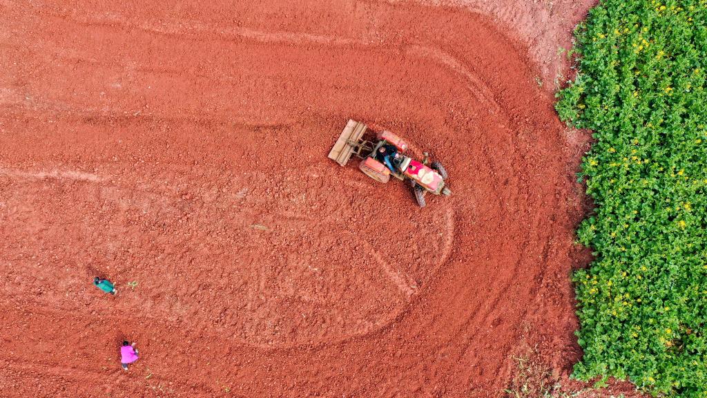 2022年2月25日,村民在四川省遂寧市安居區石洞鎮雙祠堂村勞作,為種植大豆做準備(無(wú)人機照片)。新華社發(fā)(劉昌松 攝)