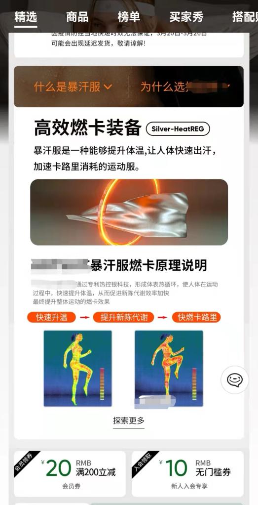 記者向一家熱門(mén)單品月銷(xiāo)超過(guò)6000件的某暴汗服網(wǎng)店咨詢(xún)該產(chǎn)品,商家解釋稱(chēng),“暴汗服采用熱控銀科技面料,可以在體表形成熱循環(huán)與熱反射,熱反射可多倍消耗熱量提升身體代謝效果,熱循環(huán)有效將身體毛孔打開(kāi)激活汗腺,達到暴汗燃脂現象”,至于減肥效果,“客戶(hù)反饋一般月瘦2-20斤左右”。一位銷(xiāo)售主播還宣稱(chēng),“只要是易胖體質(zhì),沒(méi)時(shí)間運動(dòng)的,都可以穿暴汗服,提高運動(dòng)效率和效果”。