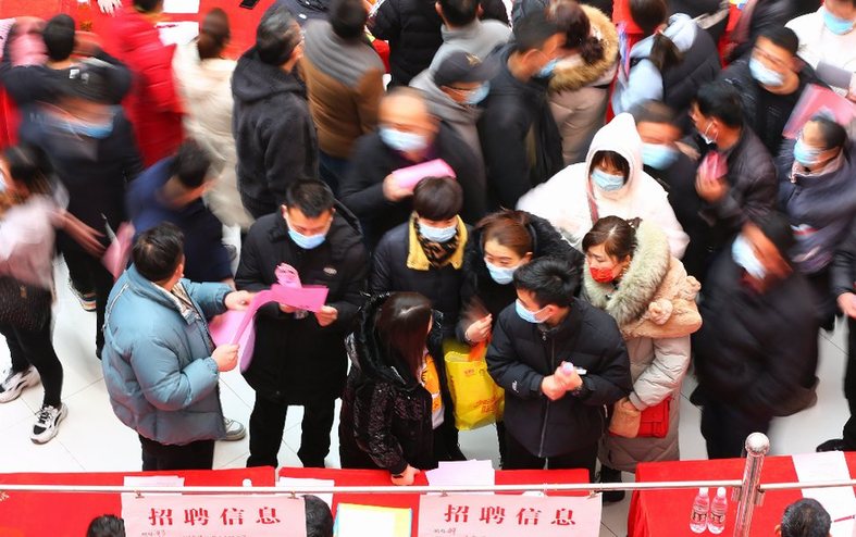 2月19日,求職人員在山東省滕州市“春風(fēng)送崗”春季人才招聘會(huì )上尋找就業(yè)崗位。新華社發(fā)(李志軍攝)