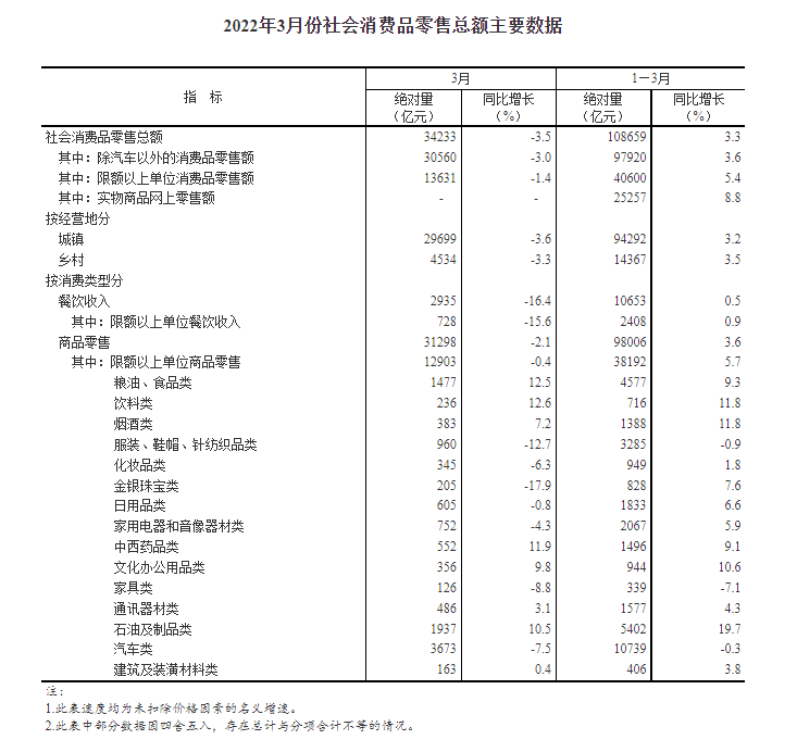 3月份,社會(huì )消費品零售總額34233億元,同比下降3.5%。其中,除汽車(chē)以外的消費品零售額30560億元,下降3.0%。