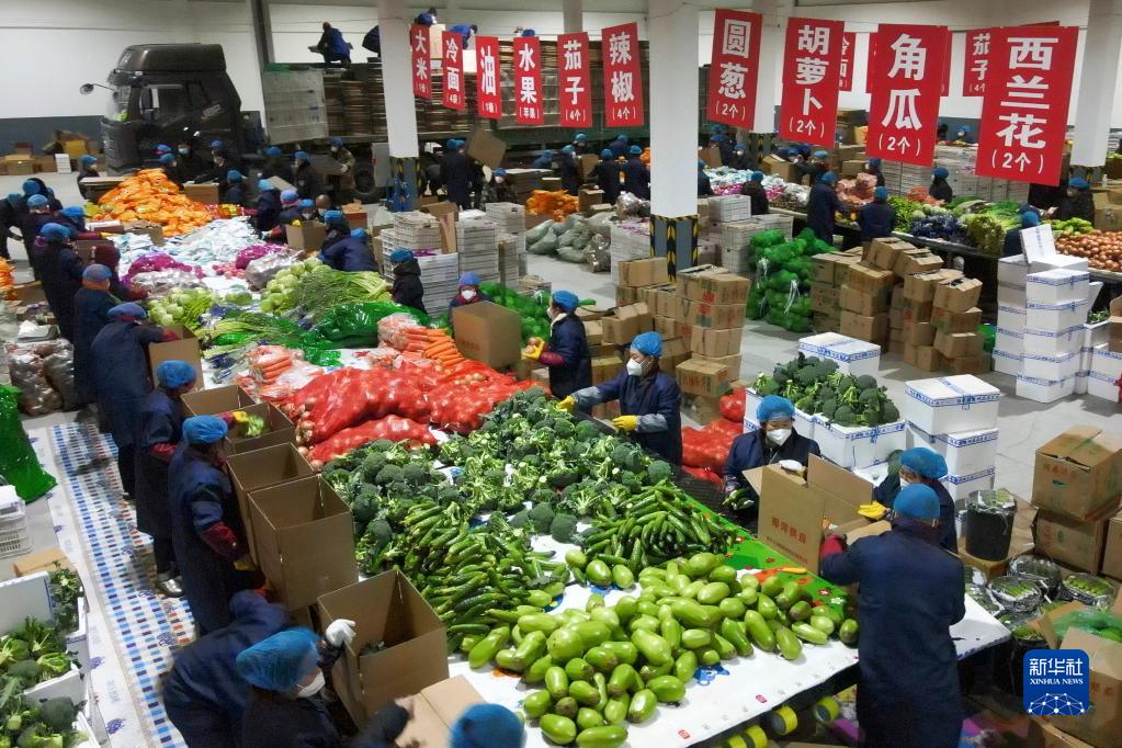 吉林省梅河口市工作人員進(jìn)行“蔬菜包”菜品分揀(4月7日攝,無(wú)人機照片)。新華社發(fā)