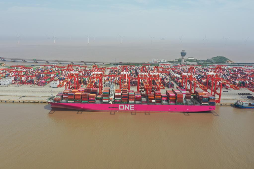 大型遠洋貨輪正在洋山深水港靠泊裝卸。(受訪(fǎng)者供圖)