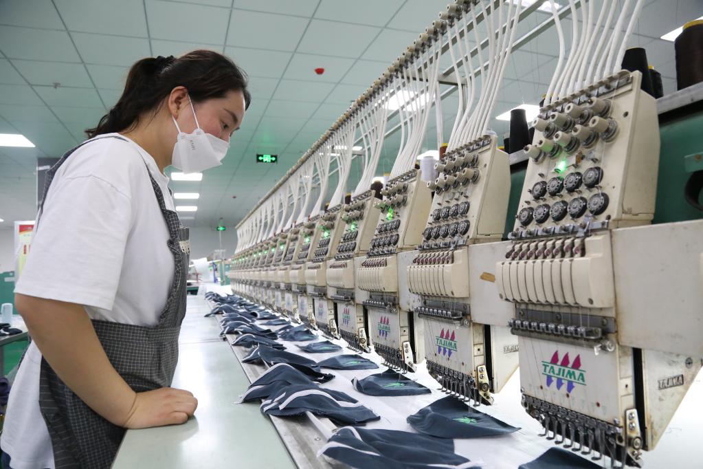 河南淮陽(yáng)瑞能服帽智能繡花車(chē)間。(新華社發(fā))