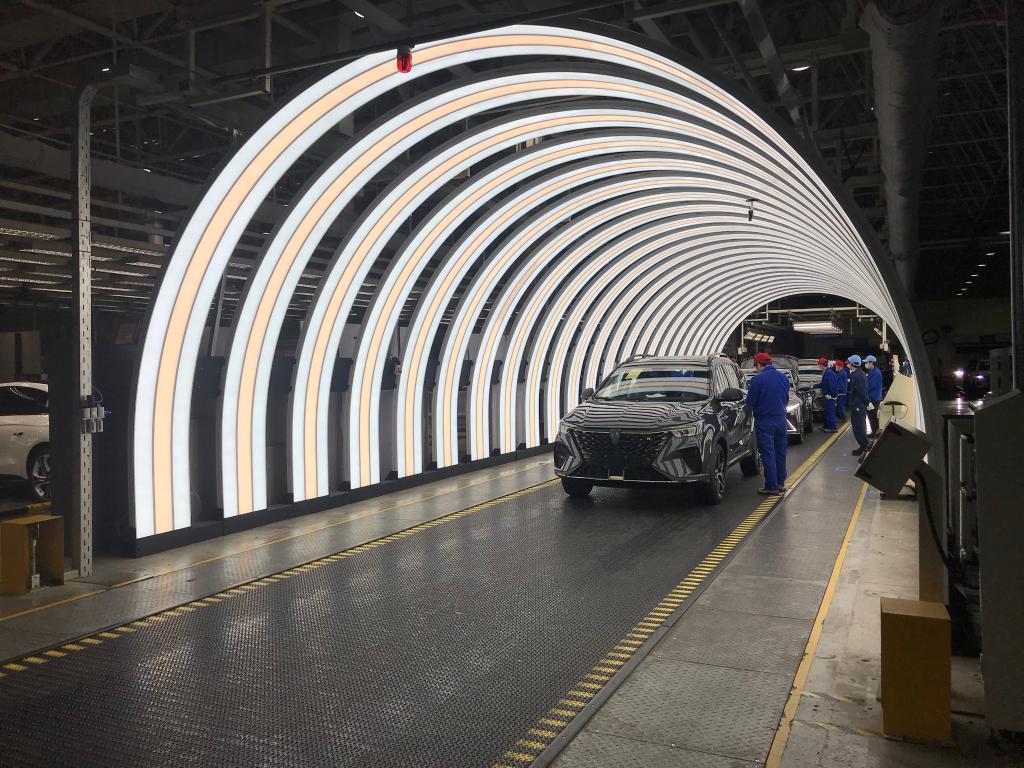 距離南港碼頭不遠的上海自貿區臨港新片區里,上汽集團臨港乘用車(chē)工廠(chǎng)內,一輛輛整車(chē)正在下線(xiàn)。