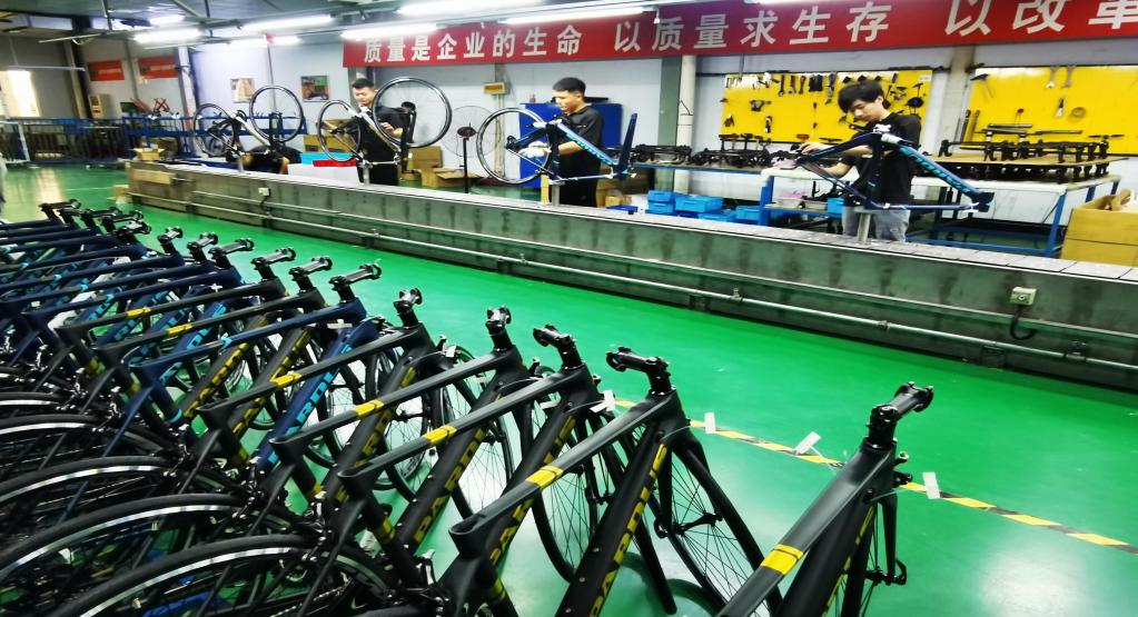 員工在山東泰山瑞豹復合材料有限公司車(chē)間里組裝碳纖維自行車(chē)。(受訪(fǎng)者供圖)