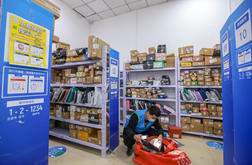6月18日,在浙江杭州一處快遞驛站,一名收攬件工作人員正在整理入站的快遞包裹。(新華社記者 張璇 攝)