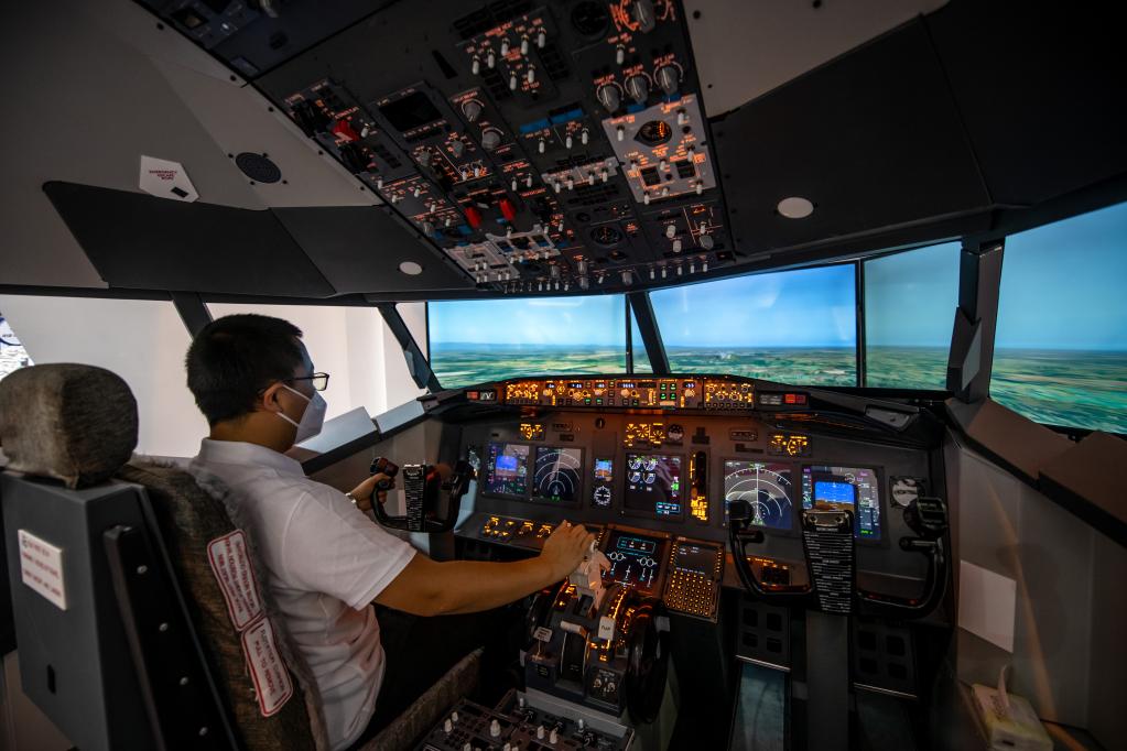 7月22日,觀(guān)眾在國航展區體驗駕駛“飛機”。新華社記者 胡超 攝