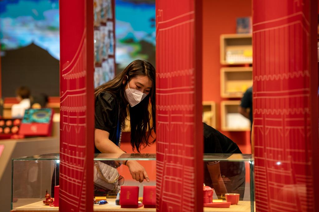 7月22日,觀(guān)眾在故宮博物院展區選購特色商品。新華社記者 胡超 攝