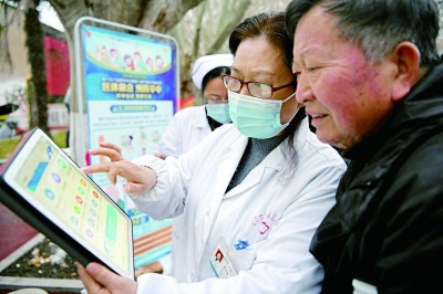安徽理工大學(xué)第一附屬醫院醫護人員指導老年患者使用互聯(lián)網(wǎng)醫院應用服務(wù)。陳彬攝/光明圖片