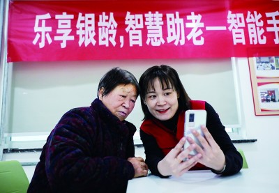 江蘇南通海安街道星海社區,志愿者為老人講解如何使用智能手機。光明圖片/視覺(jué)中國