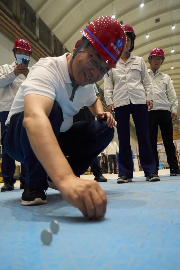 記者在百萬(wàn)千瓦水輪發(fā)電機組前豎起幾枚硬幣,均紋絲不動(dòng)。新華社記者薛晨 攝
