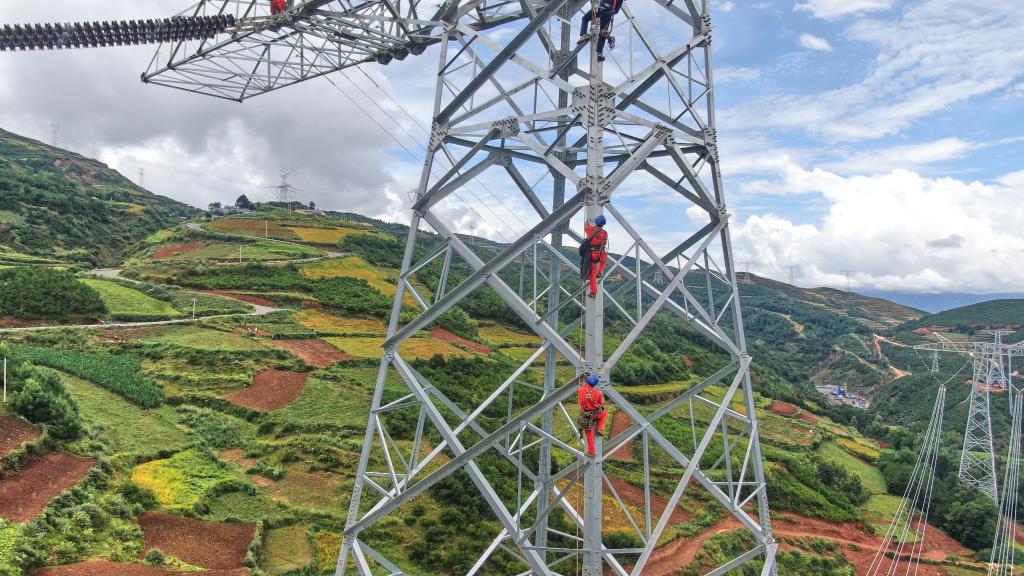 一路上,鐵塔聳立在高山間,銀線(xiàn)飛架在大嶺上。從白鶴灘水電站發(fā)出的交流電,順著(zhù)這條500千伏超高壓輸電線(xiàn)路進(jìn)入布拖換流站、轉化為直流電后,再“轉乘”±800千伏特高壓輸電線(xiàn)路送往華東地區。