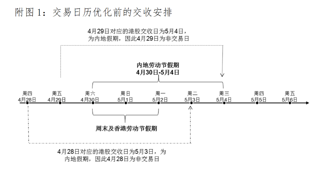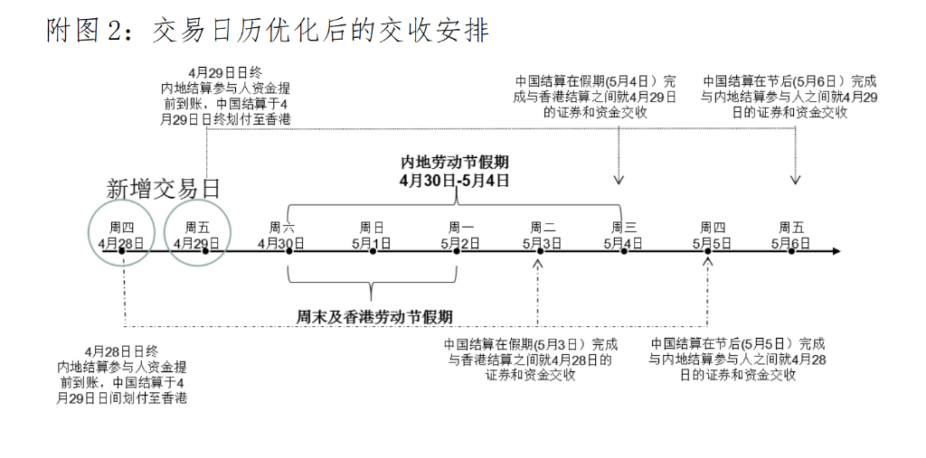 以今年的“五一”假期為例:4月28日和4月29日兩地均開(kāi)市,本地投資者在當地市場(chǎng)都可交易。但由于香港市場(chǎng)是T+2完成證券和資金的交收,上述交易日對應的港股交收日分別是5月3日和4日,為內地假期,不能辦理結算業(yè)務(wù)。因此,這兩天不能進(jìn)行港股通交易。而交易日歷優(yōu)化后,4月28日和29日內地投資者也可以通過(guò)港股通買(mǎi)賣(mài)港股標的的證券。