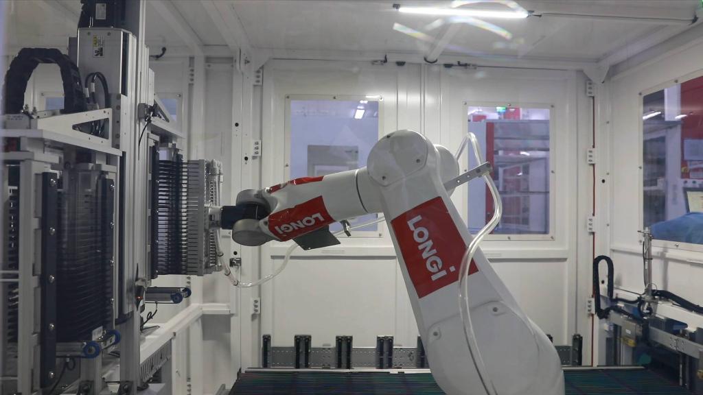 西安隆基樂(lè )葉是光伏企業(yè)隆基綠能科技股份有限公司位于西安的單晶硅太陽(yáng)能電池生產(chǎn)廠(chǎng)。生產(chǎn)車(chē)間,隨處可見(jiàn)的機器人“搬運工”將物料送到指定地點(diǎn);操作間里,伴隨機械手臂的起落,硅片的鍍膜順利完成……從制絨到鍍膜、再到印刷燒結,每一道工序都有條不紊。