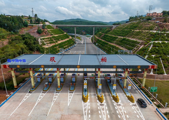 8月26日,車(chē)輛通過(guò)雙柏收費站駛入玉楚高速(無(wú)人機照片)。新華社記者 江文耀 攝