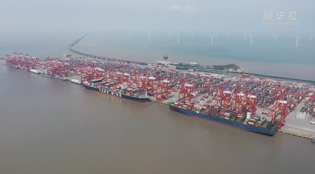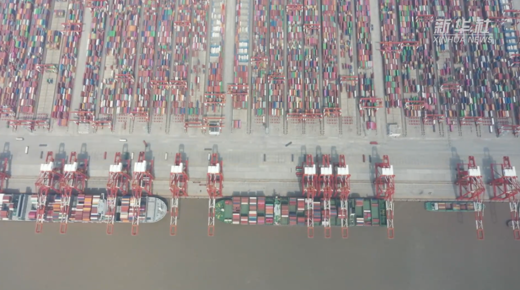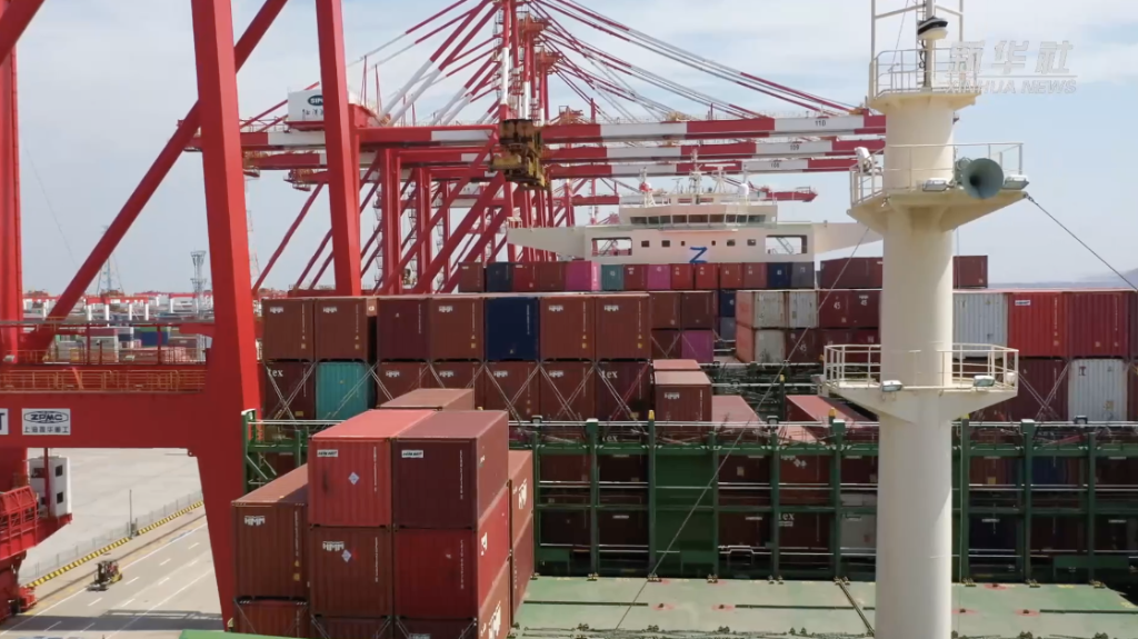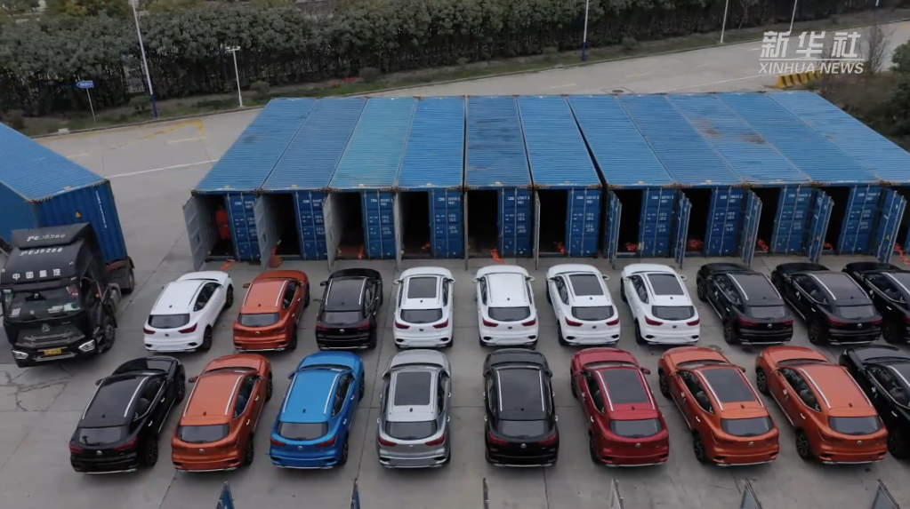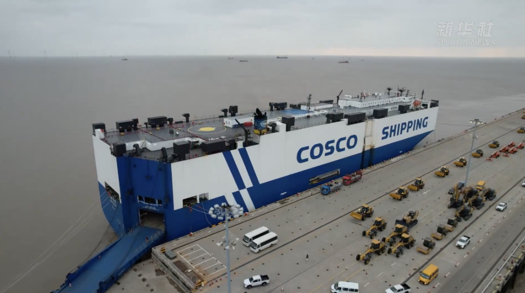 在上海集運物流堆場(chǎng),1000臺汽車(chē)被裝進(jìn)集裝箱,搭乘超大型集裝箱船“中遠海運雙魚(yú)座”輪,從上海出運至英國費利克斯托港、比利時(shí)澤布呂赫港和德國威廉港。