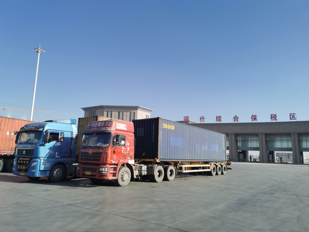 在喀什綜保區門(mén)前,貨車(chē)有序等待通行。新華社記者劉紅霞 攝